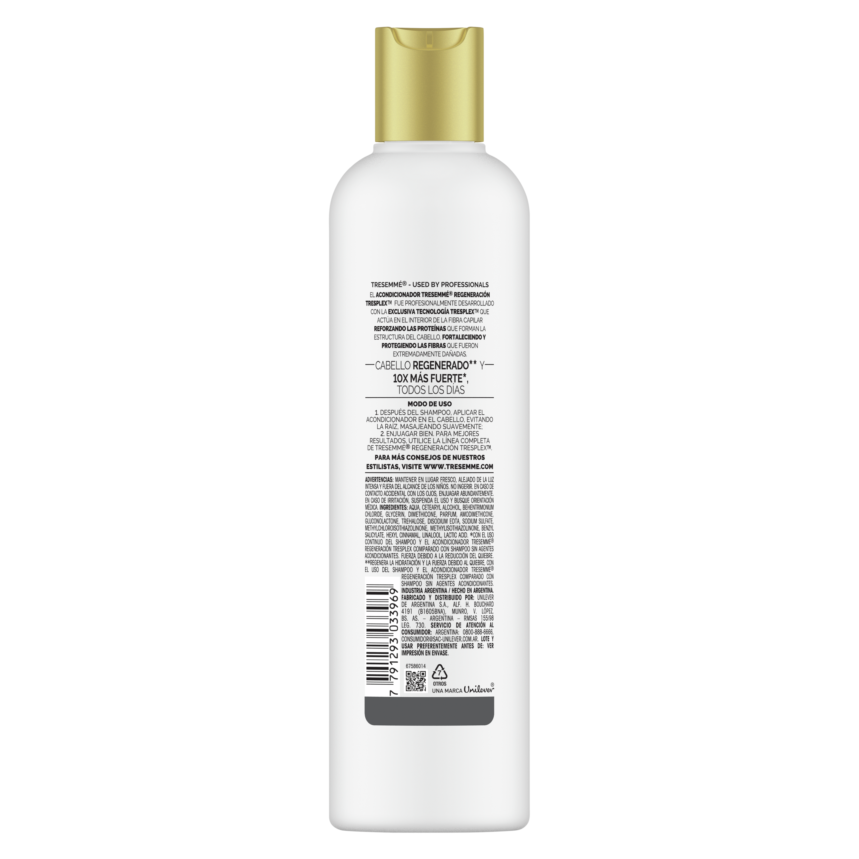 Acondicionador formulado para dejar el cabello reparado, brillante y blindado contra daños futuros. Acondicionador TRESemmé Regeneración Tresplex es la fórmula profesional con Pro-Queratina y Lípidos. Reparación capilar de la raíz a las puntas. Recupera el pelo dejándolo suave y sano lavado tras lavado. El Acondicionador Tresemmé Regeneración Tresplex te deja el pelo como recién salido de la peluquería. Recupera pelo dañado por aparatos que utilizan calor, coloración o decoloración. Es un acondicionador para pelo dañado. Tresemme Acondicionador Blindaje Platinum recupera el pelo dañado. Para proteger el pelo y su cuidado. Tresemmé Regeneración Tresplex deja el cabello reparado, brillante y brindado contra daños futuros.