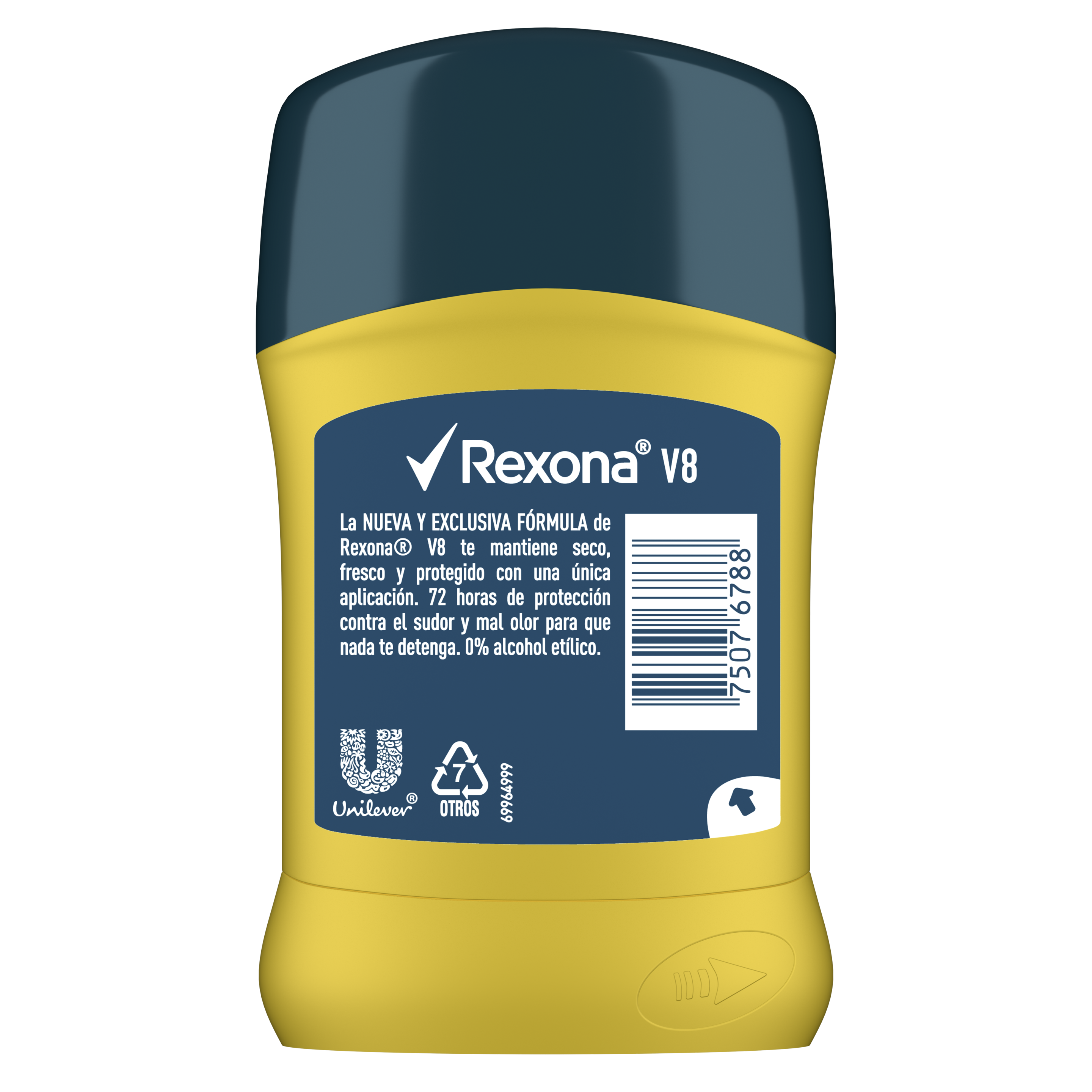 Desodorante Antitranspirante REXONA V8 en barra diseñado para fanáticos de autos. El desodorante Rexona V8 está formulado con una exclusiva tecnología activada por el movimiento; liberando protección inmediata contra el mal olor y frescura. El desodorante en barra V8 te ofrece 48 horas de protección con fragancia. Frescura en cada movimiento. Desodorante para hombres con 0% de alcohol etílico para el cuidado de la piel de tus axilas. La fragancia de este desodorante tiene notas herbales y amaderadas, brindándote una protección durante todo el día. Desodorante REXONA dermatológicamente probado.