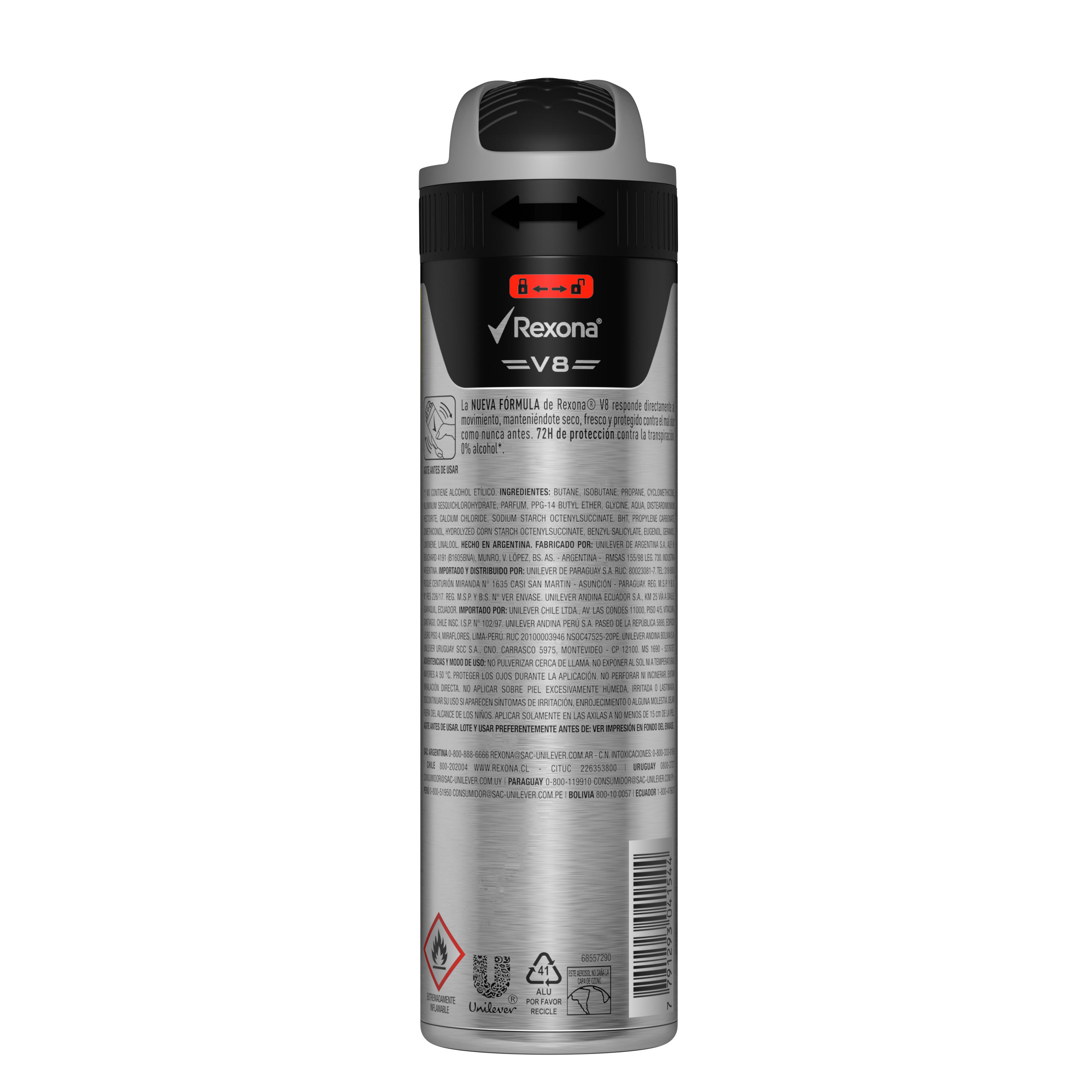 Nuevo desodorante antitranspirante Rexona Hombre V8 en aerosol con 72 horas de protección activada por el movimiento. Su fórmula entrega un nivel de protección superior* dado que combina un innovador activo antitranspirante con la exclusiva tecnología de fragancia encapsulada*vs antitranspirantes comunes en aerosol. Ultra seco y fresco en cada movimiento con los antitranspirantes Rexona. Superioridad percibida por consumidores: 84% de consumidores que probaron el nuevo Rexona afirman que cambiarían su antitranspirante actual* (*basado en estudio de consumidores). Antitranspirante Rexona 0% de alcohol etílico y dermatológicamente testeado. Antitranspirante con una clásica e intensa fragancia a base de hierbas con notas amaderadas que garantizan duración, protección y frescura.
