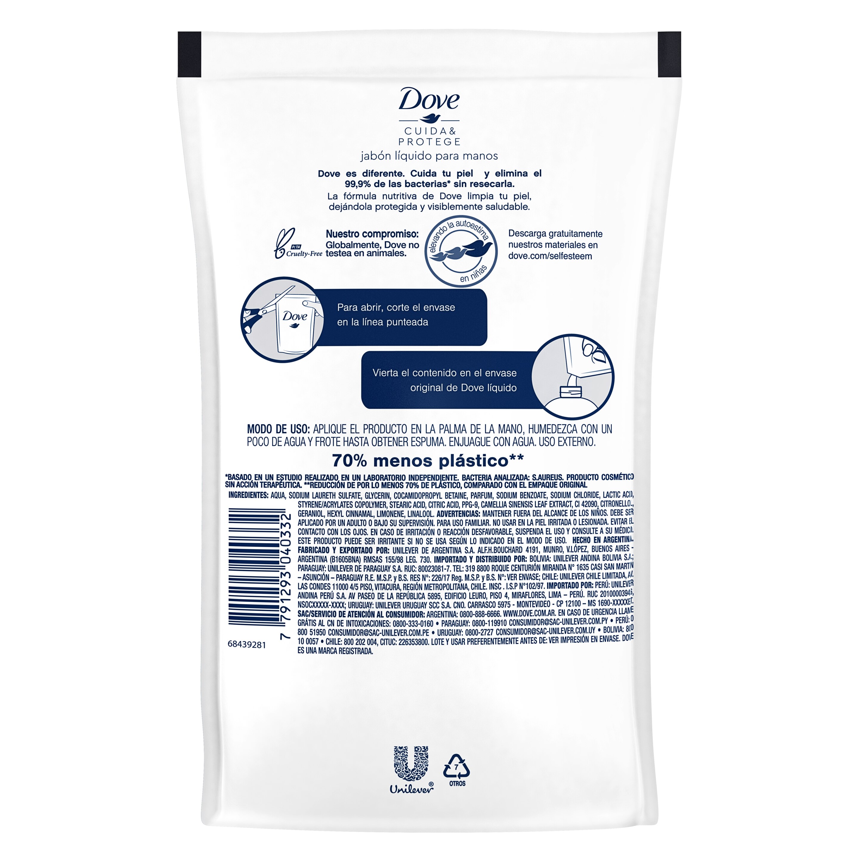 Nuevo jabón líquido Dove Cuida & Protege que elimina 99,9% de las bacterias* sin resecar tu piel. Primer rango antibacterial de los jabones Dove con ¼ de Crema Humectante y todo el cuidado de Dove. Los jabones antibacteriales Dove Cuida & Protege ayudan a reponer los nutrientes que pueden perderse durante el excesivo lavado. Clínicamente probado que el jabón líquido antibacterial Dove elimina eficazmente las bacterias sin resecar la piel. Jabón con Ácido Láctico: Un antimicrobiano que actúa por su efecto en el pH. Jabón con Matcha: un extracto de té verde con efectos inhibitorios comprobados contra una amplia variedad de bacterias.