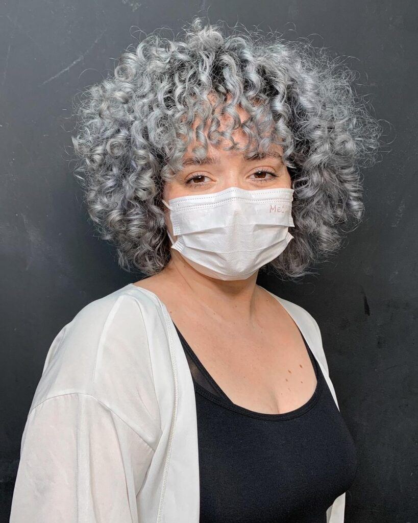 Os tons prateados do cabelo cinza valorizam e destacam os cachos de um jeito lindo e moderno