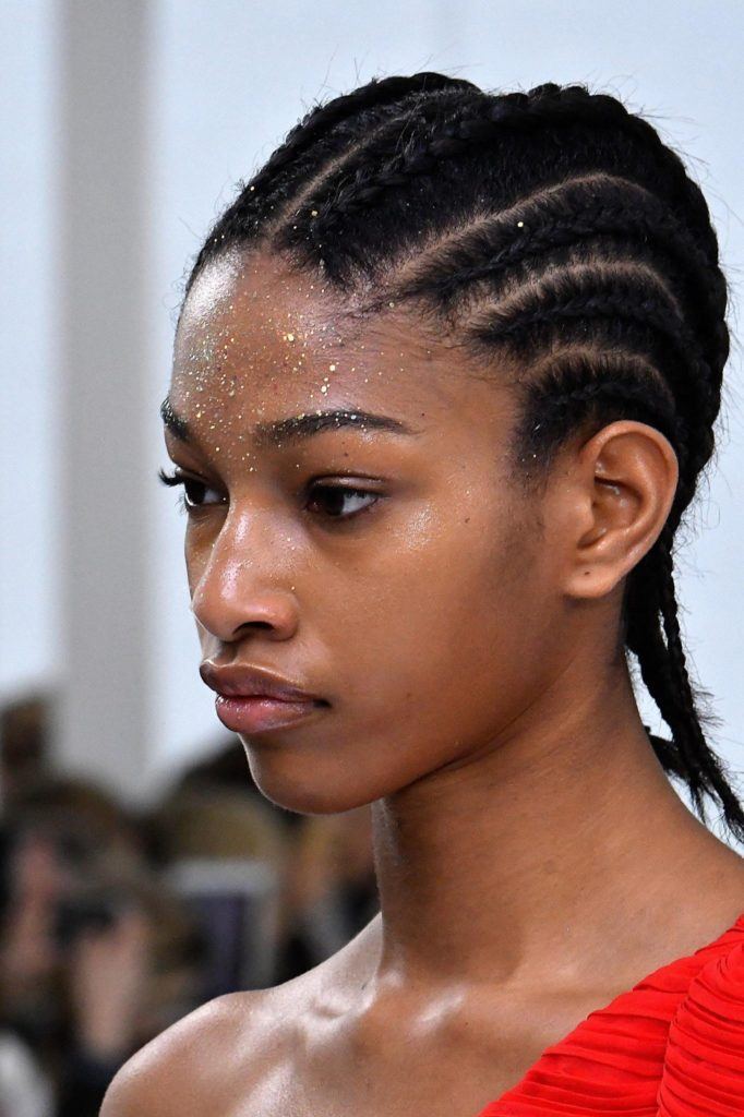 Acho que iria aposentar o glitter pós-Carnaval? No que depender da semana de moda britânica, o brilho continua a todo vapor no restante do ano! Aqui, a purpurina apareceu na franja e na raiz dos cabelos, adicionando um toque mágico ao visual invernal. O efeito é parecido com o das luzes de glitter, sobre as quais já falamos por aqui. Aposte tem medo de brilhar por aí! Neste desfile, as modelos negras ainda ganharam trancinhas enraizadas, ou cornrows. Estilo de sobra!