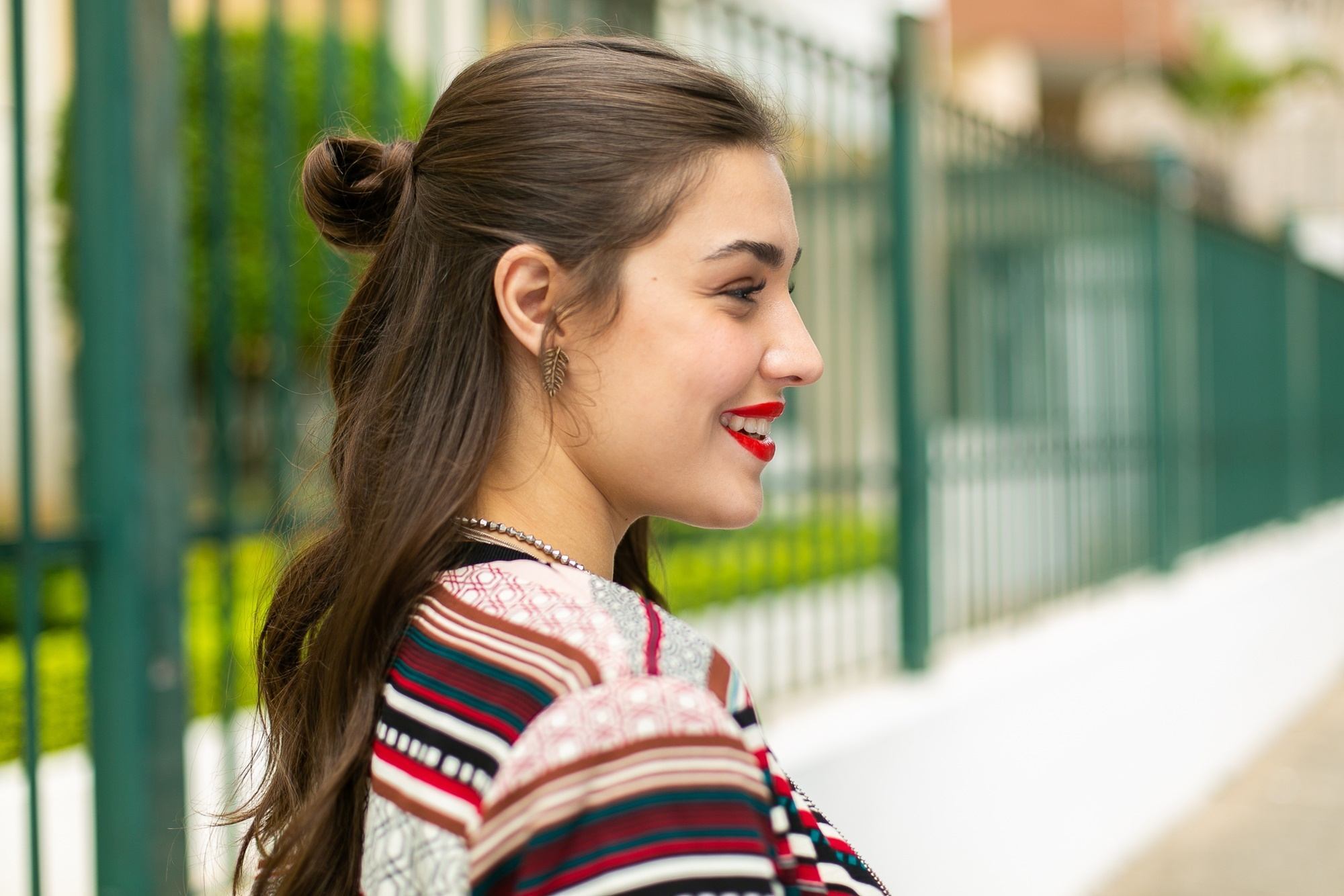 O coque semipreso, também conhecido como half bun, é aquele cabelo de Ano-novo na praia despretensioso, de quem quer um penteado bonito, mas sem parecer arrumado demais. O estilo fica lindo com textura, que adiciona volume ao look. Bom para quem não quer prender completamente os fios, mas manter uma parte sob controle.